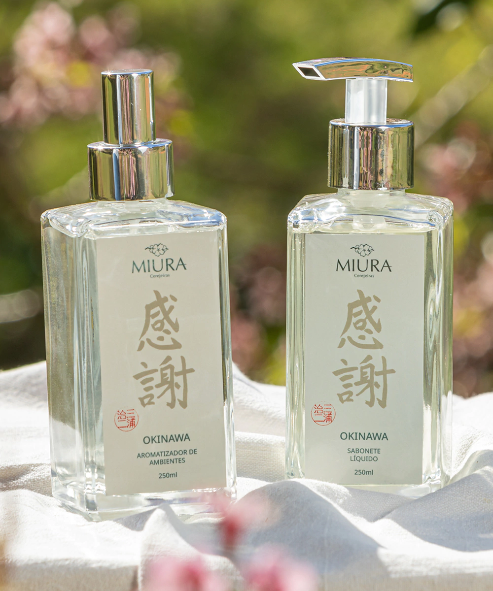 A fragrância OKINAWA transporta você̂ para um jardim japonês repleto de flores de cerejeiras do Sr. Miura, promovendo bem-estar e relaxamento e belas lembranças!