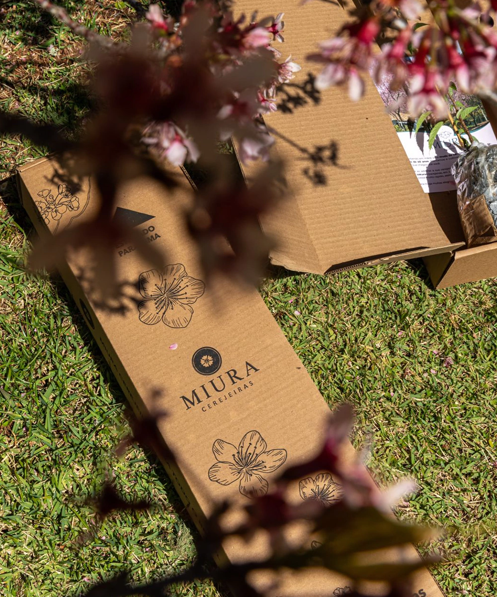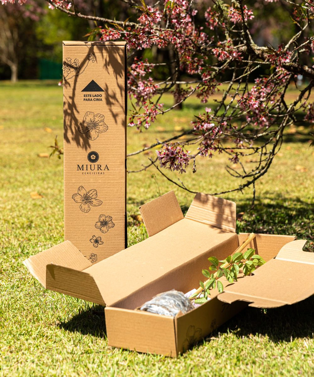 A muda de cerejeira japonesa ornamental que cultivamos é da espécie Okinawa, que é rosa claro. É a espécie que melhor se adaptou ao nosso clima. Ela vai na caixa que desenvolvemos, tem aproximadamente 55 cm de altura.